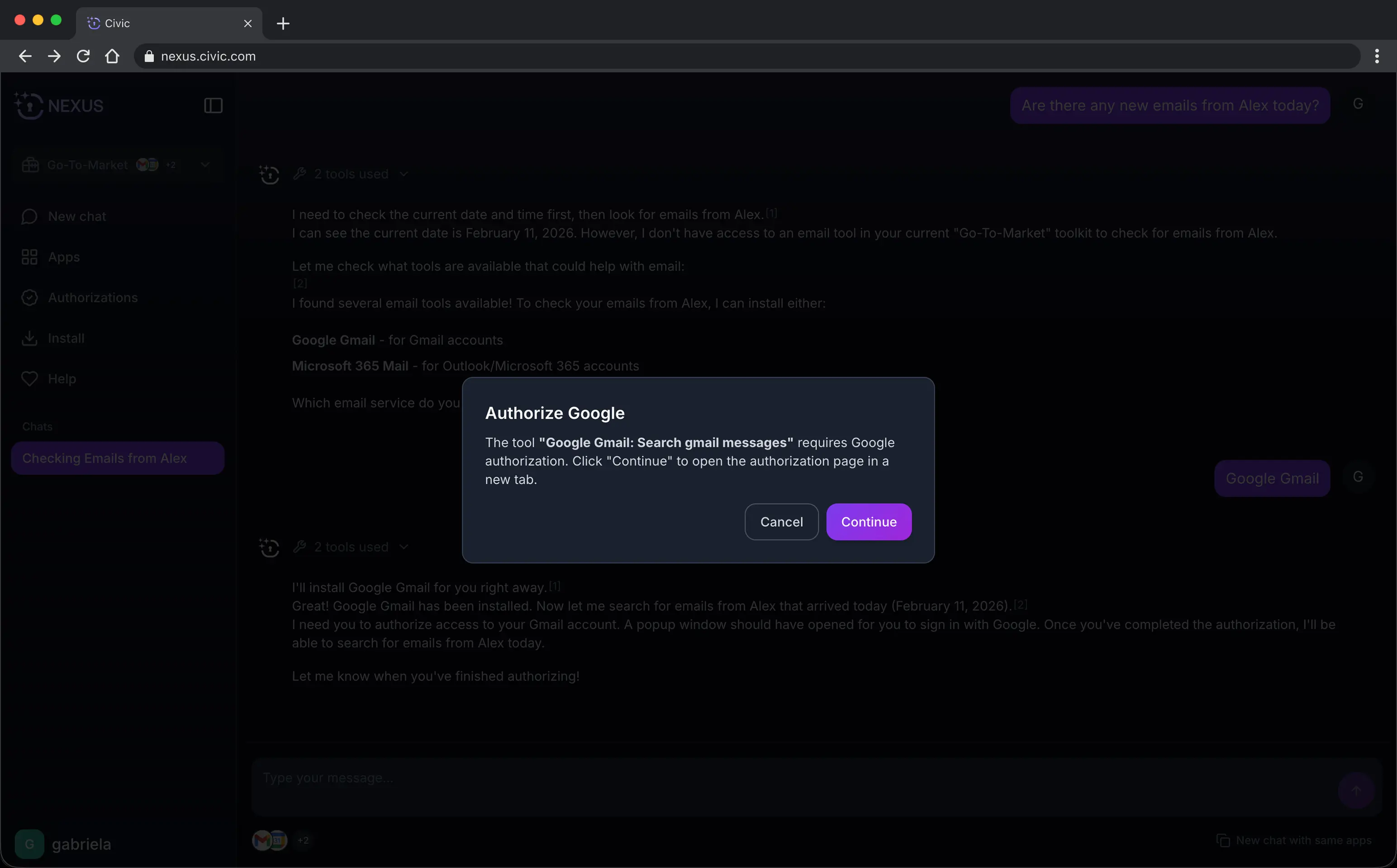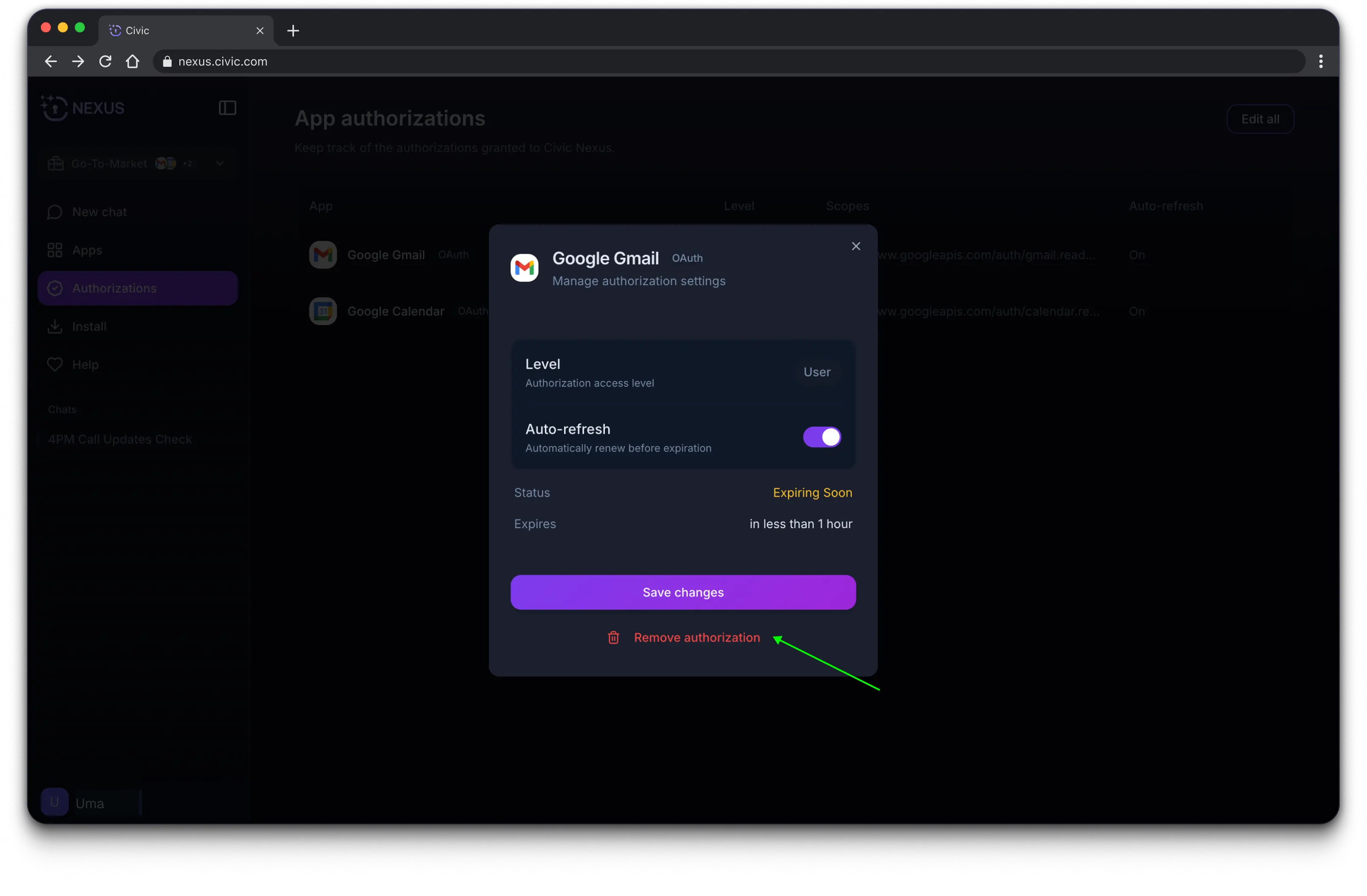 An authorization is your permission for Civic Nexus to access a specific app on your behalf. This allows your AI assistant to work inside that app for you.
